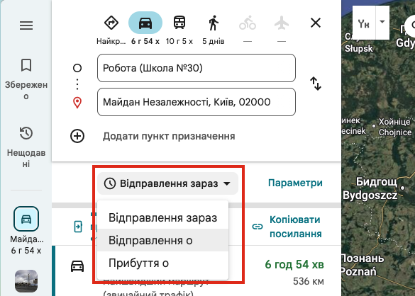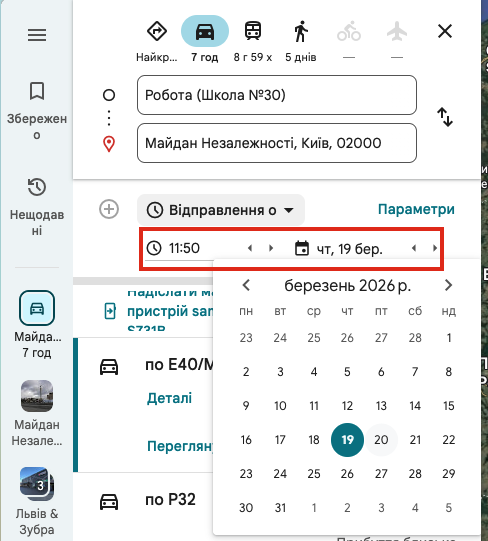 Уявіть, що ми плануємо подорож зі своєї школи до Майдану Незалежності в Києві. Наша мета — провести комп'ютерний експеримент у Google Картах, щоб визначити, як різні види транспорту та час відбуття впливають на час у дорозі.